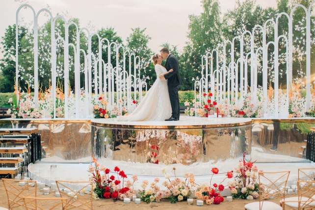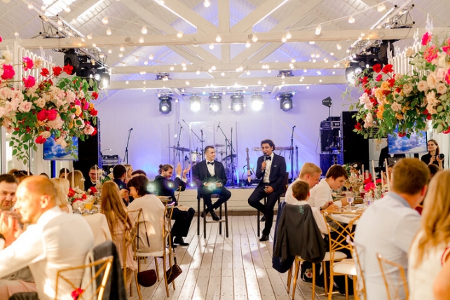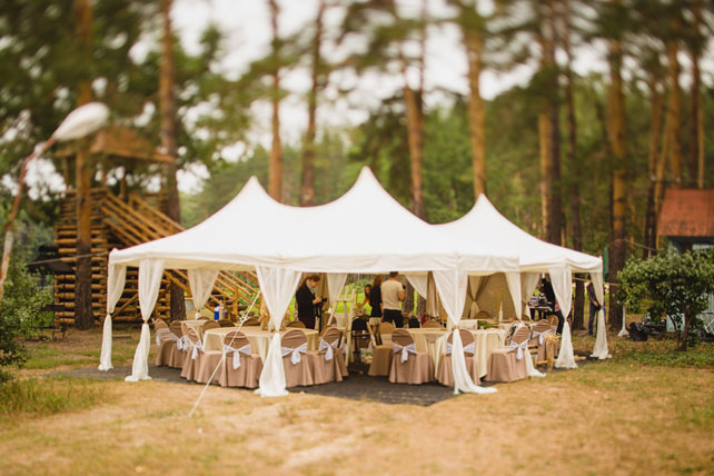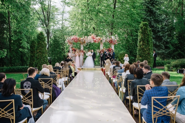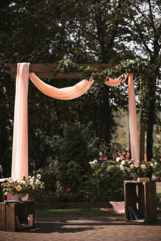 Нередко текстиль, который есть на площадке, не подходит для свадьбы. Поэтому его специально обшивают. Это очень важный элемент, который придаст вашему торжеству благородства и шика.