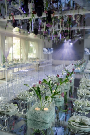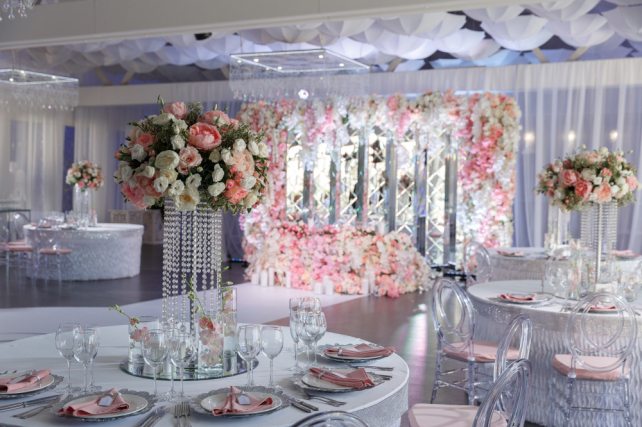 4. Декорирование тканями и цветочными композициями пяти столов гостей